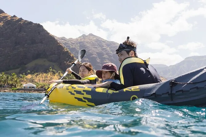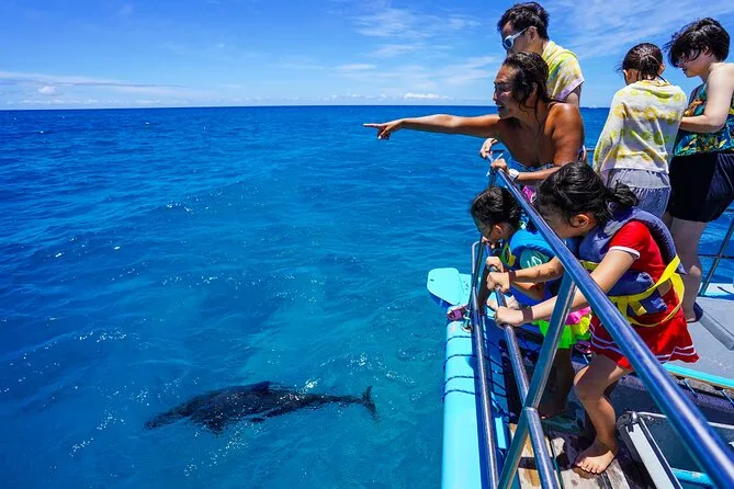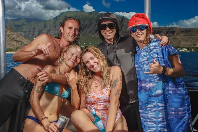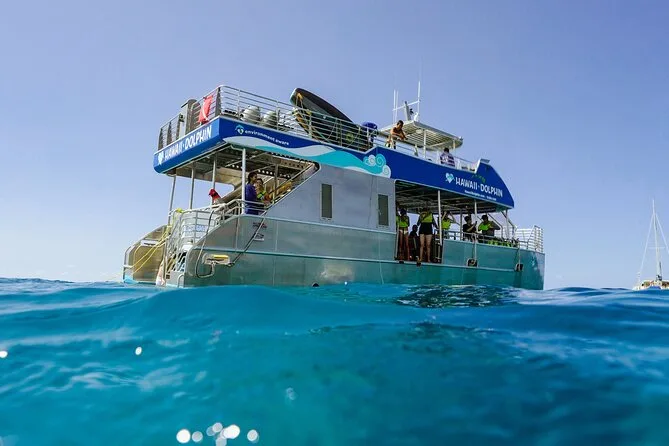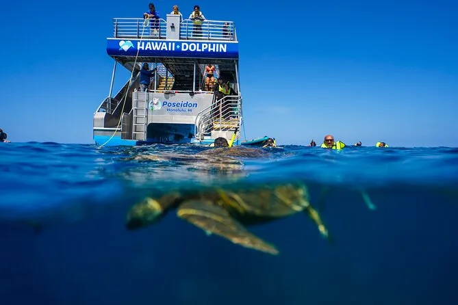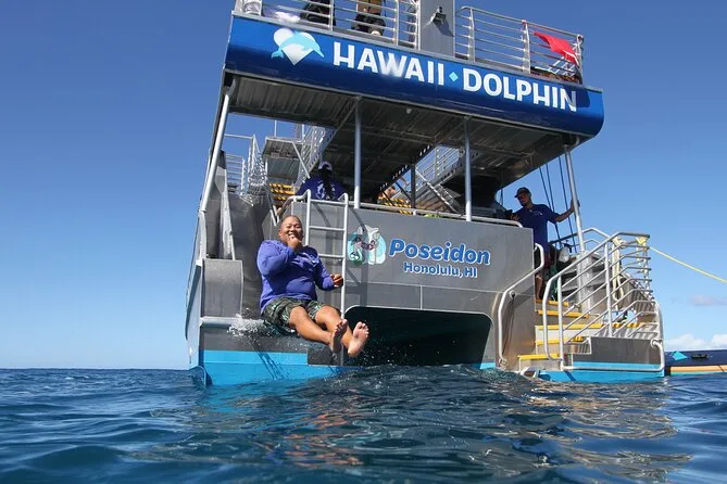 Spring ins klare Wasser der Pazifik-Westküste Oahus, schwimm mit wilden Delfinen (wenn sie da sind), schnorchel am Makaha Beach mit Schildkröten und bunten Fischen, rutsche eine riesige Katamaran-Wasserrutsche runter und genieße das Mittagessen an Deck. Salzige Haut, glückliche Erschöpfung – und Erinnerungen, die länger bleiben als gedacht.