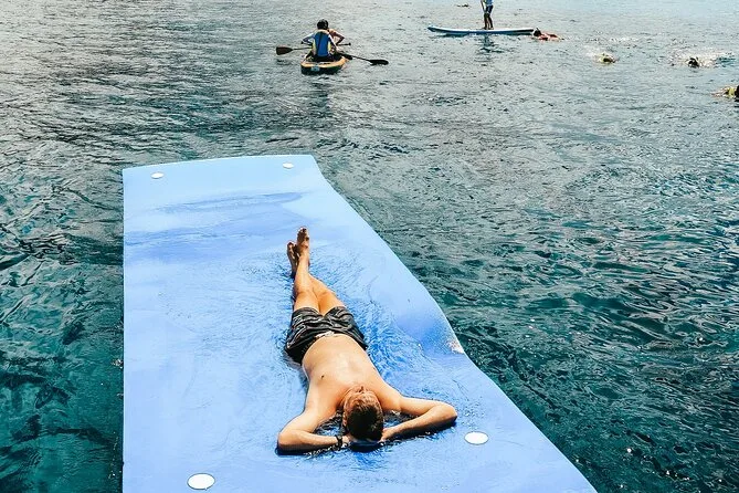 Ja, eine 6-Meter-Wasserrutsche am Katamaran, Stand-Up-Paddling, Kajakfahren und Entspannen auf schwimmenden Matten.