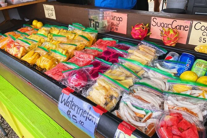 Ich hätte nie gedacht, dass ich an einem Obststand am Straßenrand so viel lachen würde. Eine der Verkäuferinnen, eine „Auntie“, versuchte anhand unserer Akzente zu erraten, woher wir kommen – bei mir lag sie falsch (ich bin nicht Kanadier, vielleicht liegt’s am „about“). Wir kauften ein paar Drachenfrüchte und kleine Apfelbananen für später. Als wir am Kahuku Sugar Mill zum Mittagessen ankamen, knurrte mein Magen schon wieder. Dort reihen sich unzählige Food Trucks aneinander – Giovanni’s Shrimps sind herrlich chaotisch (Knoblauch überall), aber ehrlich gesagt träume ich noch immer von Da Bald Guy’s Poke Bowl. Das Mittagessen zahlst du selbst, hast aber genug Zeit, um zu stöbern und dir das auszusuchen, was dir am besten schmeckt.
