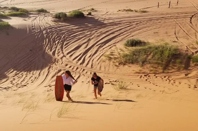 Ja, Sandboarding auf den Dünen gehört zum Programm beim Sonnenuntergang.