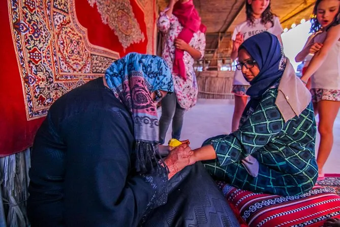 Bei Einbruch der Dämmerung erreichten wir das Lager, das von Fackeln und Laternen erleuchtet wurde. Dort ließ ich mir von Aisha ein Henna-Tattoo machen – sie arbeitete flink und erzählte dabei von ihren Kindern, während sie winzige Blumen auf meine Hand malte. Das Abendessen war ein Buffet mit gegrilltem Hähnchen, Lammkebabs, frischen Salaten und einem rauchigen Auberginen-Dip, von dem ich nicht genug bekam. Später versammelten sich alle ums Lagerfeuer zum Bauchtanz (die Musik war laut, aber mitreißend). Einige probierten Shisha unter dem Sternenhimmel – ich lehnte mich zurück und genoss einfach den Moment. Die Rückfahrt fühlte sich irgendwie ruhiger an; vielleicht lag es daran, dass ich immer noch an den Sonnenuntergang dachte.