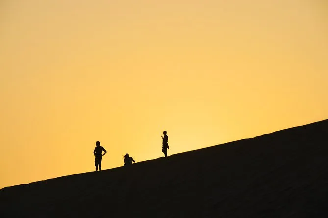 Bevor die meisten überhaupt wach waren, machten wir Halt auf einer Kamel-Farm. Die Kamele kauten schon gemütlich und schauten uns mit ihrem typischen langsamen Blinzeln an. Unser Guide Khalid verteilte kleine Tassen Kardamom-Kaffee und Datteln – süß und klebrig, genau das Richtige, um wach zu werden. Dann ging’s richtig los: Dune Bashing. Laut und holprig, aber ehrlich gesagt lacht man mehr, als dass man schreit, wenn der 4x4 die Sandhänge runterrutscht. Danach probierten wir Sandboarding – ich bin zweimal hingefallen, bevor ich den Dreh raus hatte. Sand landet überall – in den Schuhen, Taschen, sogar in meiner Kameratasche – aber das Adrenalin, wenn man endlich die Düne runtergleitet, ist jede Mühe wert.