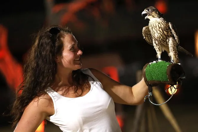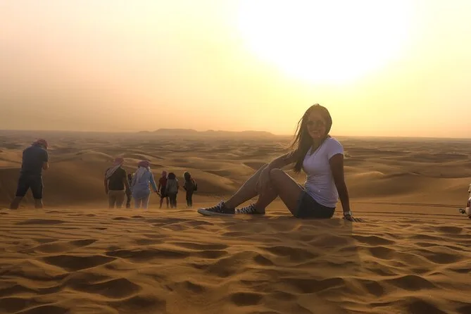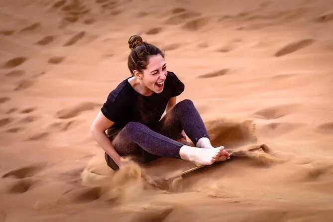Die Tour umfasst Dune Bashing, Sandboarding, Kamelreiten, Henna-Malerei, Shisha-Rauchen, traditionelle Tanzshows und ein BBQ-Buffet.