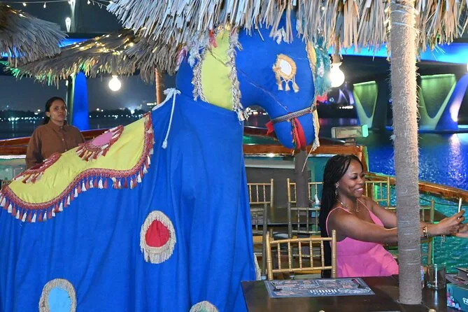 Die Stadt veränderte sich schnell, während wir weiterfuhren – mal sah man nur Holzboote und Händler, die laut riefen, im nächsten Moment leuchteten Glasfassaden in Blau und Pink im Abendlicht. Ich wechselte ständig zwischen den Spiegelungen im Wasser und kleinen Happen vom Buffet (diese kleinen Lamm-Kebabs gehen mir nicht aus dem Kopf). Zwischendurch gab es eine Puppen-Bauchtanzshow – ehrlich, ich hätte nicht gedacht, dass ich bei einer Puppe mit Pailletten so lachen würde. Die Kinder an Bord kicherten sich schlapp.