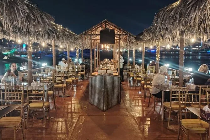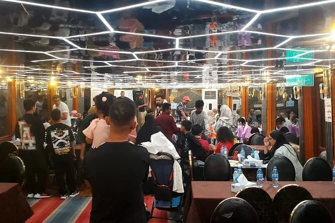 Wir saßen oben an Deck, um die Brise zu genießen, aber manche gingen unten rein, wo es wärmer war und die Musik besser zu hören. Ein Tanoura-Tänzer wirbelte so schnell, dass sein Rock zu einem wilden Farbwirbel wurde – ich wollte filmen, hab’s aber gelassen und einfach zugeschaut. Getränke wurden serviert (für uns alkoholfrei), und Ahmed fragte, ob noch jemand etwas brauchte. Er schien jeden am Steg zu kennen; die Leute winkten uns zu. Es fühlte sich an, als wäre man Teil von etwas Lokalem, obwohl man natürlich Besucher ist.