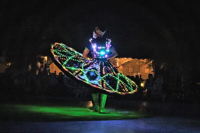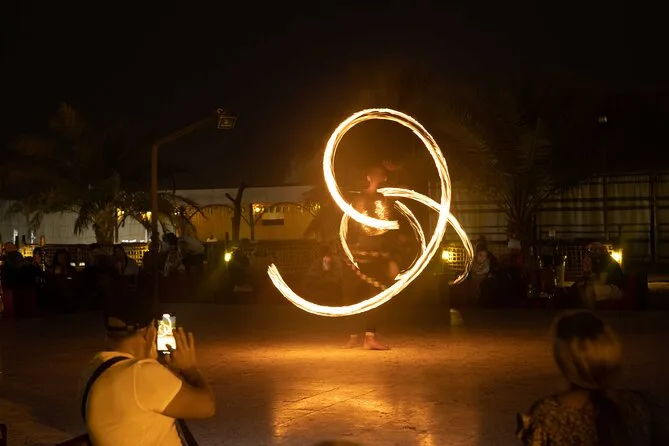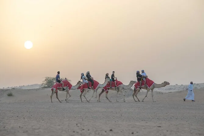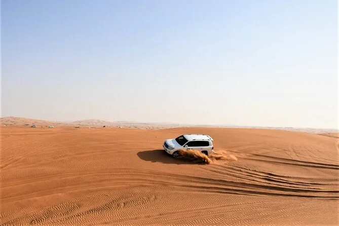 Dein Tag startet mit Abholung vom Hotel in Dubai im klimatisierten 4x4 Land Cruiser; 30 Minuten Quadfahren ohne Führerschein; bis zu 45 Minuten Dünen-Bashing; Sandboarding; Kamelritt bei Sonnenuntergang; Fotos mit einem Falken; unbegrenzt Softdrinks, Kaffee und Tee; professionelle Henna-Malerei; Shisha-Rauchen; offenes BBQ-Buffet mit vegetarischen und fleischhaltigen Gerichten; Live-Shows mit Bauchtanz, Tanoura und Feuershows – und zum Schluss Rückfahrt zum Hotel am späten Abend.