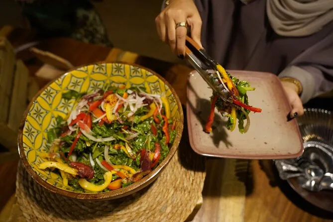 Wir hielten an, um Fotos zu machen, genau in dem Moment, als das Licht weich und golden wurde. Da war dieser Augenblick, in dem alles still wurde, bis auf den Wind, der über die Dünen strich. Dann versuchte jemand aus einer anderen Gruppe Sandboarding und stürzte spektakulär – alle jubelten. Es war eine freundliche Atmosphäre – Menschen aus aller Welt, die gemeinsam diese seltsam schöne Leere teilten. Später im Al Khayma Camp reichten sie uns kleine Tassen Qahwa-Kaffee (ich versuchte höflich zu nippen – bitter, aber irgendwie wohltuend) mit süßem Gaymat und Datteln. Das Camp leuchtete im Laternenlicht und roch nach gegrilltem Fleisch und Gewürzen, die immer wieder vorbeizogen.