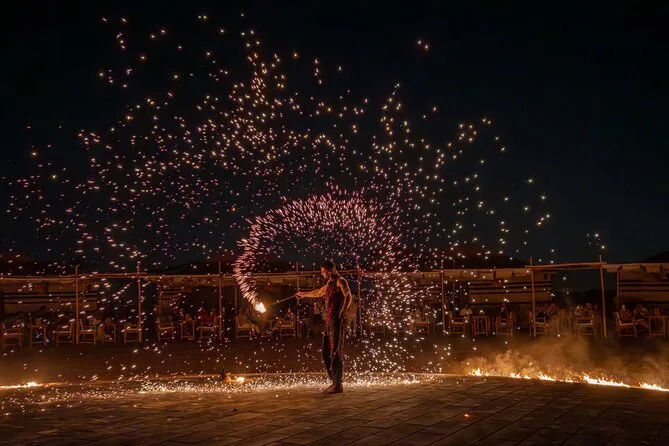 Ich bin etwa zehn Minuten Kamel geritten (die sind größer, als man denkt) und habe ein Foto mit einem Falken gemacht, der mich nur halb genervt ansah. Henna-Malen kitzelte mehr, als ich dachte – und Li lachte, als ich versuchte, „Shisha“ richtig auszusprechen (bin mir immer noch nicht sicher, ob ich es geschafft habe). Der Yola-Tanz brachte alle zum Mitklatschen, auch wenn keiner so genau wusste, was wir da machten. Die Feuershow? Ehrlich gesagt der Wahnsinn – die Hitze spürt man noch aus Metern Entfernung.