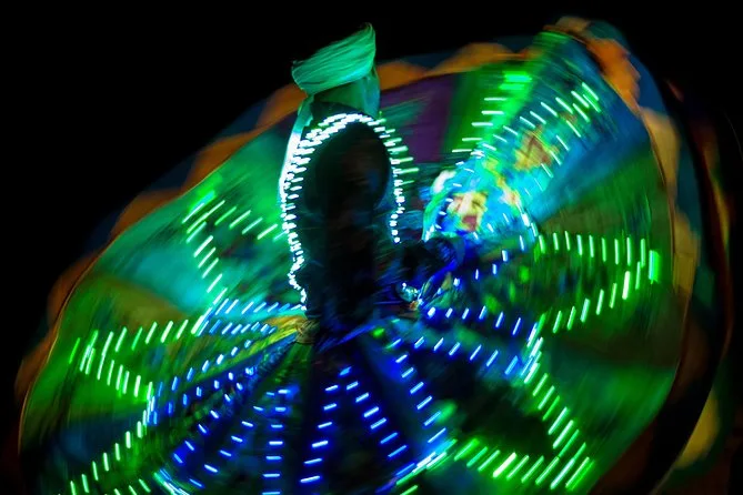 Dein Abend umfasst Hotelabholung und Rückfahrt im klimatisierten Land Cruiser, adrenalintreibende Dünenfahrten, unbegrenzte Softdrinks sowie Tee oder Kaffee, Live-Shows mit Bauchtanz, Tanura, Feuershow und Al Ayyala, Sandboarding, Henna-Malerei, mehrere kurze Kamelritte, Shisha in ausgewiesenen Bereichen, ein Buffet-BBQ mit vegetarischen Optionen, Foto-Sessions in traditionellen Kostümen – alles begleitet von freundlichen lokalen Guides, bevor es nachts zurück zum Hotel geht.