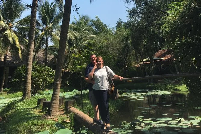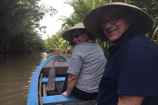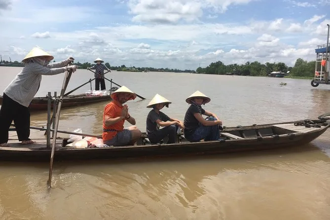 Am nächsten Tag fuhren wir nach My Tho im Mekong-Delta – ein paar Stunden Busfahrt südwärts mit einem kurzen Stopp in einem Bonsai-Garten am Straßenrand (die Luft roch leicht süß von blühenden Blumen). Die Vinh Trang Pagode fiel mit ihrer Mischung aus vietnamesischen und Khmer-Elementen auf; Mönche bewegten sich leise zwischen goldenen Statuen im Inneren. Wir bestiegen ein Motorboot auf dem Tien-Fluss, vorbei an schwimmenden Fischfarmen und Stelzenhäusern, die in leuchtendem Blau oder Grün gestrichen waren. Auf der Insel Thoi Son reichten uns Einheimische Nón Lá-Hüte, bevor wir versuchten, Sampans unter bogenförmigen Kokospalmen zu rudern – meine Arme wurden schnell müde! Zwischendurch tranken wir Honigtee auf einer Bienenfarm, während jemand in der Nähe Volksmusik spielte; später hielt ich sogar eine Python – nichts für jedermann. Zum Mittag gab es frischen Flussfisch und tropische Früchte, draußen unter Mangobäumen.