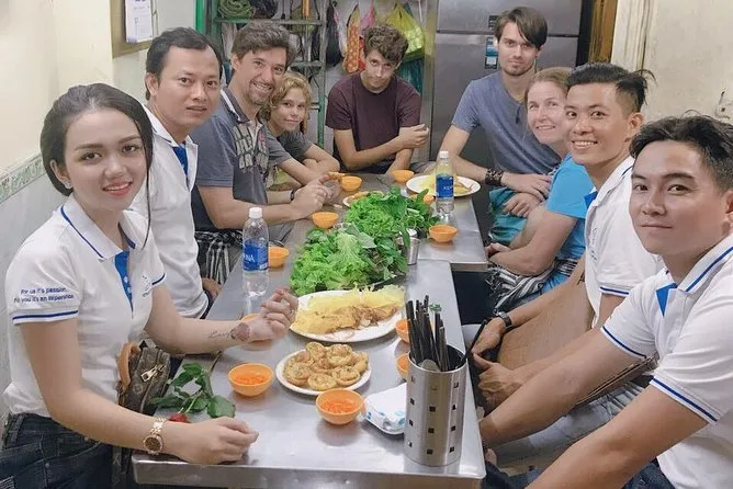 Am späten Nachmittag zurück in Saigon machten wir uns bereit für eine Street-Food-Tour per Roller. Als Sozius durch den Berufsverkehr zu fahren ist wild – der Verkehr fließt wie Wasser um dich herum, Hupen ertönen, aber niemand ist wütend. Unser erster Halt: knusprige Bánh Xèo-Pfannkuchen, die in einer Gasse auf einer Grillplatte brutzelten, wo Plastikstühle am Bordstein standen. Wir lernten, sie mit Kräutern einzuwickeln und in Fischsauce zu dippen – chaotisch, aber köstlich. Später führte uns unser Guide in einen alten Wohnblock („chung cư“) zu einem versteckten Café ohne Schild; der Tropfkaffee hier ist so stark, dass er dich die ganze Nacht wachhalten könnte.