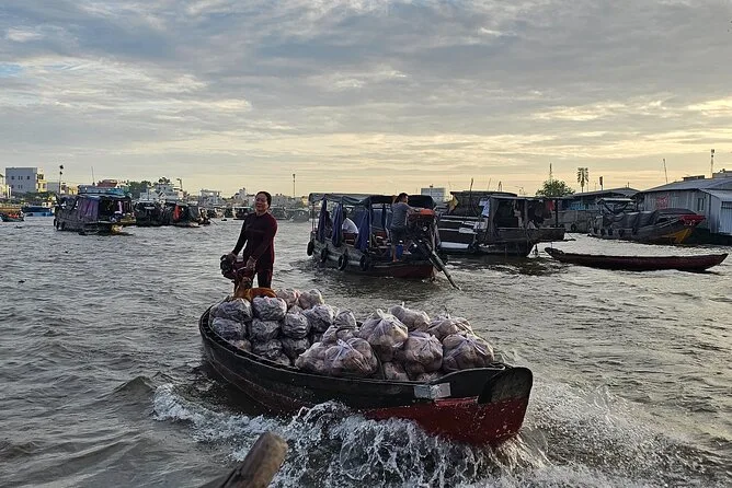 Cai Rang ist einer der größten schwimmenden Märkte Vietnams, wo Händler jeden Morgen direkt von ihren Booten Obst und Gemüse verkaufen.