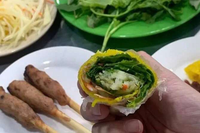 Du probierst Banh Loc, vietnamesische Pizza, My Quang Nudeln, Nem Lui Spieße, gegrilltes BBQ-Fleisch oder Meeresfrüchte (je nach Menü), grünen Tee und Kokos-Gelee als Dessert.