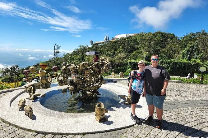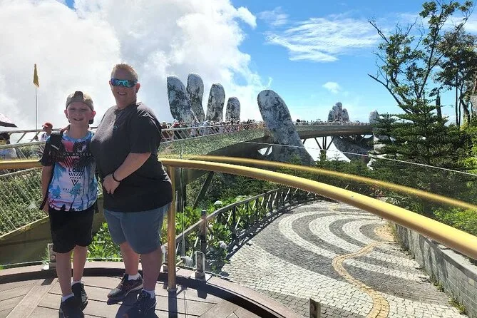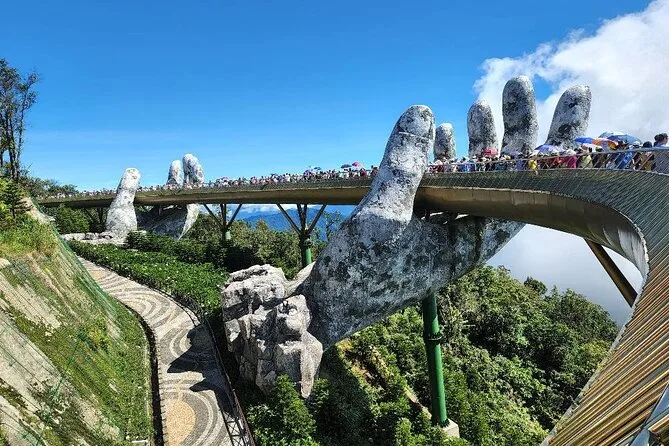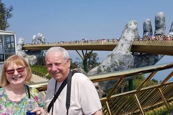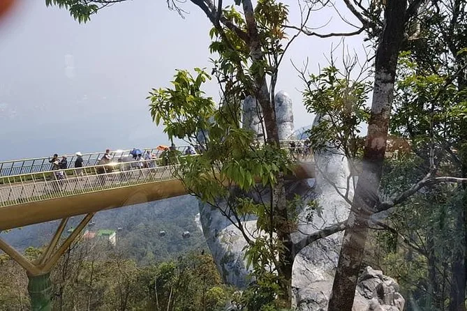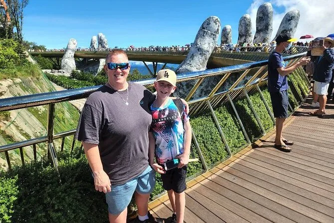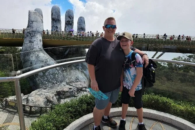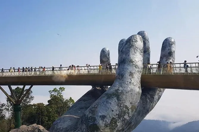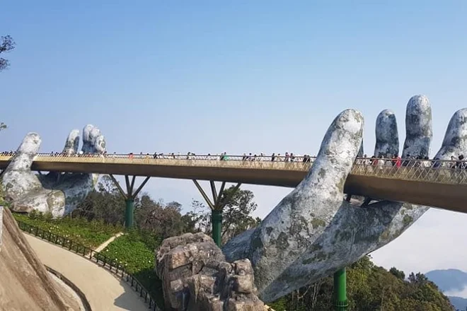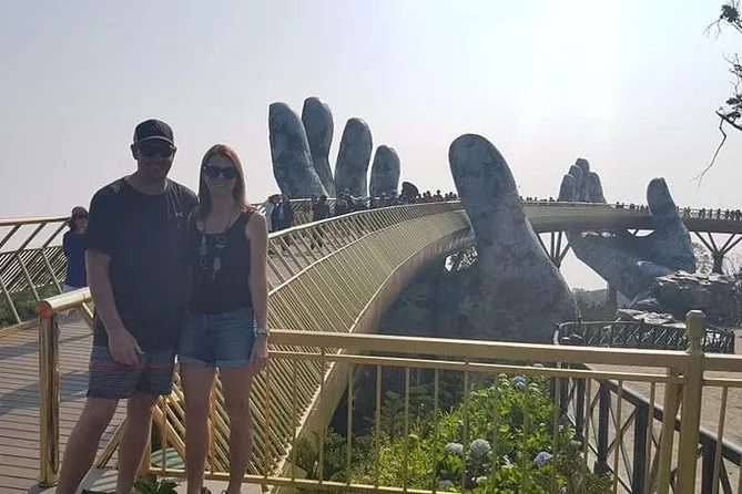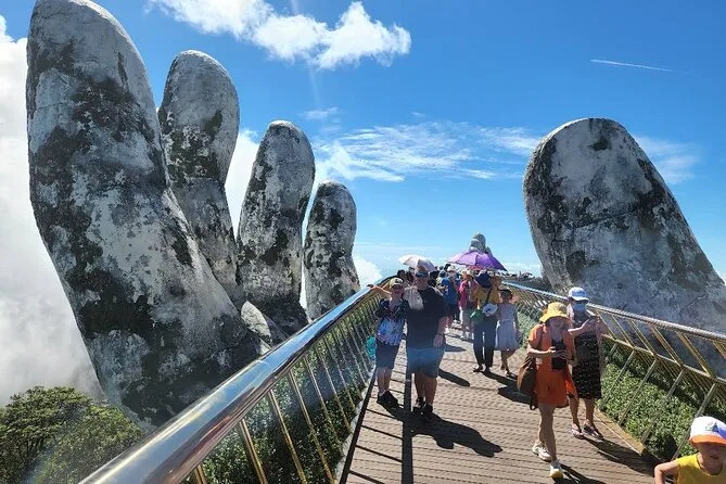 Von der Golden Bridge hatte ich schon gehört, doch nichts bereitet einen wirklich auf den ersten Anblick vor. Wir stiegen in die Seilbahn – die sanfteste Fahrt, die ich je erlebt habe – und sahen, wie Nebelschwaden über die Baumwipfel zogen. Oben angekommen sieht die Brücke tatsächlich so aus, als würde sie von zwei riesigen steinernen Händen getragen. Das Holz unter den Füßen fühlte sich warm und fest an, und wenn man sich ein wenig vorbeugte, konnte man bis hinunter zur Stadt Da Nang blicken (nichts für schwache Nerven). Unser Guide erzählte ein paar Fakten: 148 Meter lang, gebaut aus Merawan Giaza-Holz, und die Handläufe? Die glänzen im Sonnenlicht tatsächlich golden.