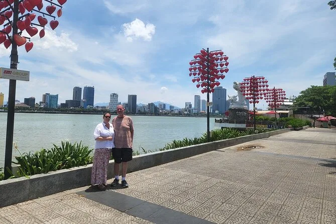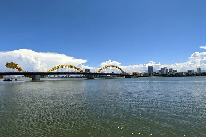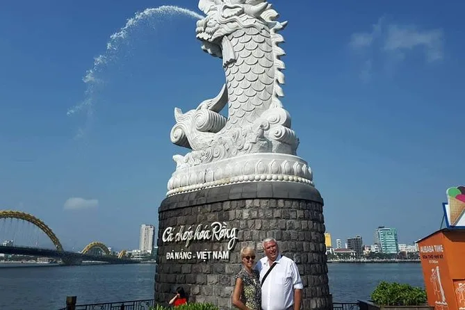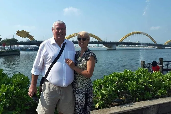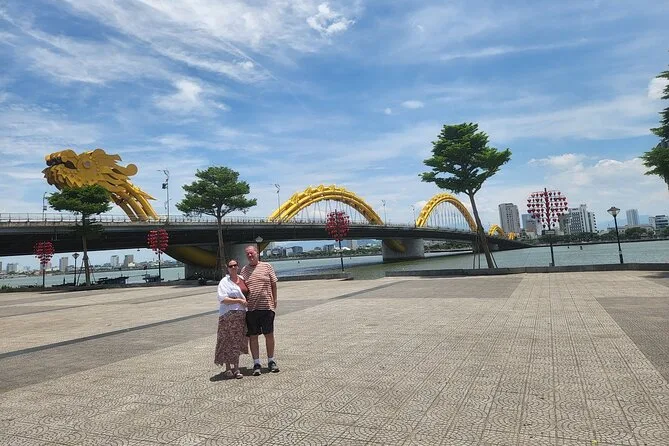 Das Mittagessen war ein Buffet – viele lokale Gerichte, deren Namen ich nicht aussprechen konnte, die ich aber sehr genossen habe. Danach fuhren wir direkt in die Stadt Da Nang. Die Stadt wirkt sauber und modern, dabei aber entspannt. An der Dragon Bridge rauschte der Verkehr vorbei, während die Leute Fotos machten. Unser Guide erklärte, dass die Einheimischen glauben, Drachen bringen Glück – eine Tradition, die Jahrhunderte zurückreicht. Wer Glück hat und an einem Wochenende abends hier ist, kann sogar das Feuer- und Wasserspektakel erleben (wir haben es um einen Tag verpasst!).