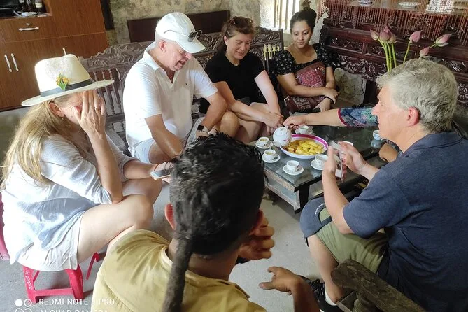 Später sattelten wir die Räder und radelten durch schmale Dorfwege. In der Luft lag ein leichter Duft von Holzrauch, und ab und zu hörte man einen Hahn krähen oder Kinder hinter den Gartenmauern lachen. Wir machten Halt bei einer Familie, in der drei Generationen zusammenleben – die Großmutter knackte gerade Erdnüsse an der Tür, während ihre Enkelin uns den Hof zeigte. Das Mittagessen war einfach, aber lecker: Tofu in Tomatensoße, knusprige Frühlingsrollen und „cá kho“ – karamellisierter Wels aus dem Tontopf.