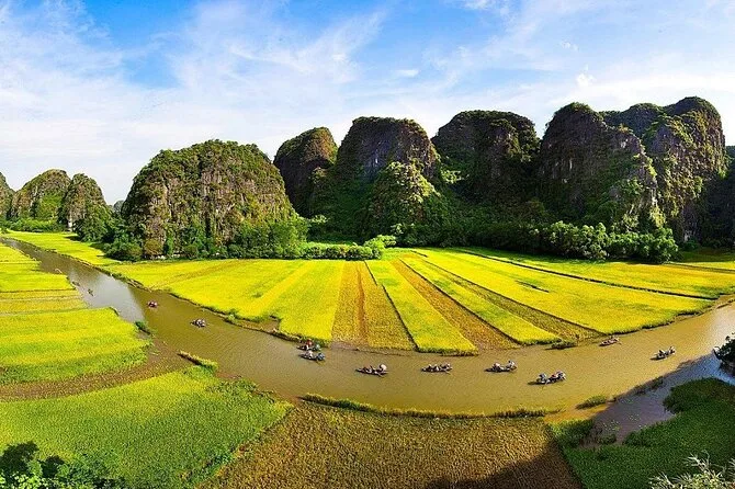 Wandere auf Hang Mua mit atemberaubender Aussicht, radle durch ruhige Dörfer und Reisfelder, genieße ein Mittagessen bei einer einheimischen Familie, gleite mit dem Boot durch Tam Cocs Höhlen und entdecke Vietnams erste Hauptstadt – alles an einem Tag in kleiner Gruppe.