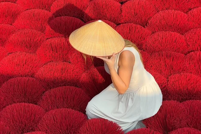 Danach fuhren wir etwa 40 Minuten weiter zum Räucherstäbchen-Dorf Quang Phu Cau. Die Straße wurde voller, dann öffnete sich plötzlich ein wildes Bild: Hunderte leuchtend rote Räucherstäbchen lagen wie riesige Blumen in den Höfen verteilt. Der Duft traf mich zuerst – süßlich, holzig, aber nicht zu stark. Überall waren Menschen, die plauderten, arbeiteten oder einfach über uns Touristen lachten, die versuchten, das perfekte Foto zu schießen. Ich machte bestimmt hundert Bilder, doch am meisten beeindruckte mich eine Frau, die die Stäbchen von Hand rollte. Sie grinste, als ich fragte, ob ihre Hände jemals wieder normal riechen würden („Nie!“ antwortete sie).