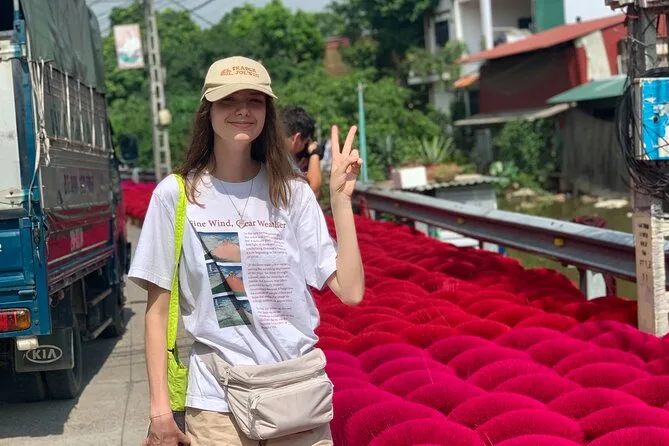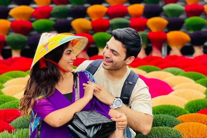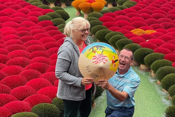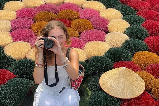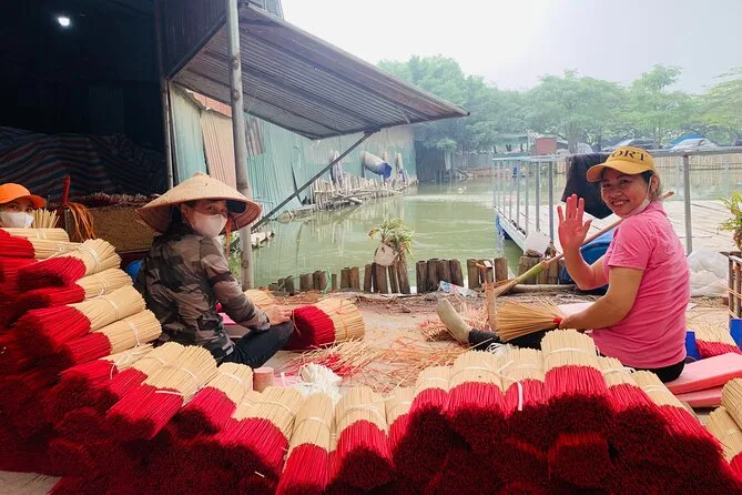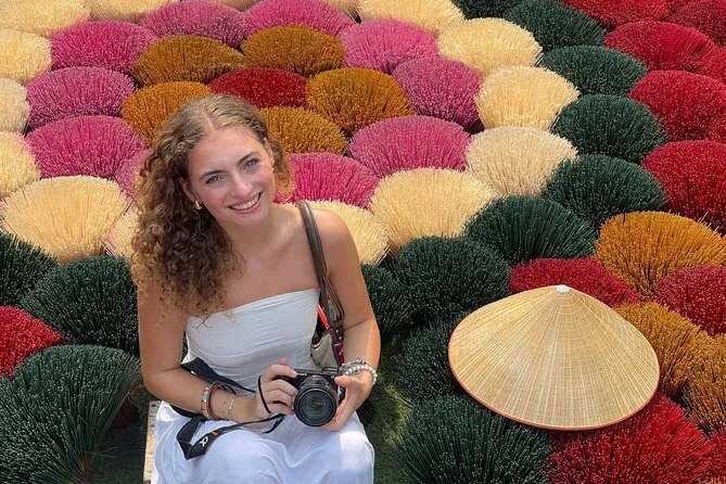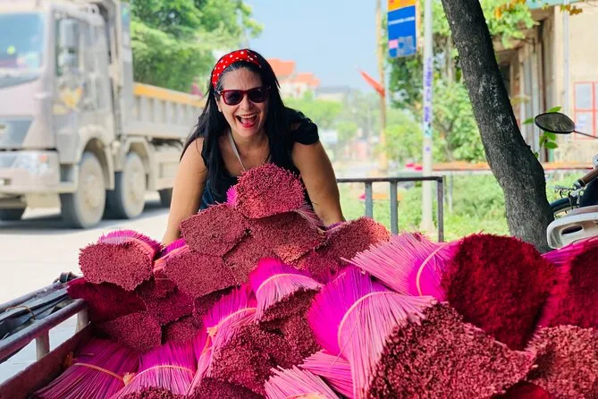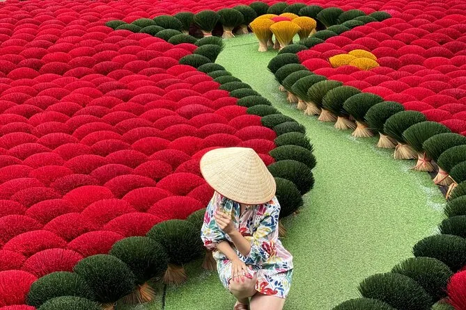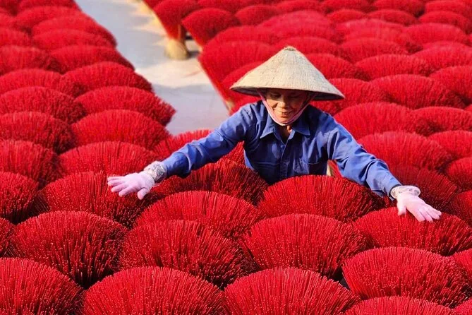 Spaziere durch die ruhigen Gassen von Chuong, triff Kunsthandwerker beim Flechten der Kegelhüte und gestalte deinen eigenen. Im Räucherstäbchen-Dorf Quang Phu Cau fotografierst du die leuchtend roten Stäbchen beim Trocknen und siehst, wie die Einheimischen duftende Mischungen herstellen. Mit einem lokalen Guide, der spannende Geschichten erzählt – inklusive Abholung – erwartet dich ein halber Tag voller Farben und kleiner Überraschungen.