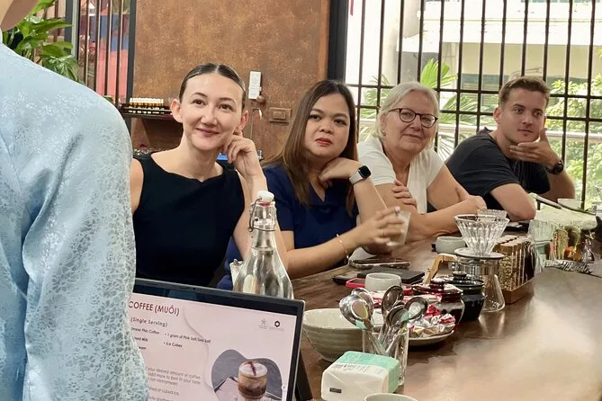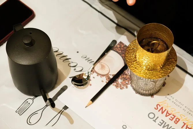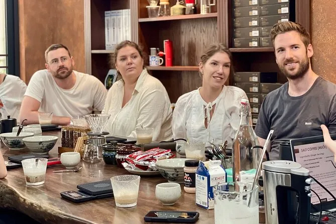 Der Workshop war von Anfang an praktisch. Wir mahlten die Bohnen zusammen (das ist viel schwerer als gedacht) und Hien zeigte uns, wie verschiedene Röstgrade alles verändern – wir durften jede Sorte erst einmal riechen, bevor wir sie aufbrühten. Mein Lieblingsmoment? Das Aufschlagen des Eigelbs für den berühmten Eiskaffee – nach etwa zehn Sekunden war mein Arm müde und alle lachten, aber irgendwie wurde mein Becher oben schön cremig und darunter dunkel. Die Textur war einfach perfekt ungewöhnlich. Dann kam der Salzkaffee (ja, klingt komisch), aber die Mischung aus bitter, süß und salzig passt einfach perfekt zusammen. Der Kokoskaffee war fast wie ein Dessert – kalt, vollmundig und nicht zu süß.