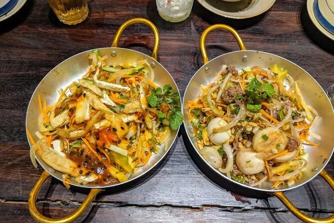 Du probierst Gerichte wie Rind- und Hühnernudeln, Klebreis, gedämpfte Pfannkuchen, Donuts, Schneckenspezialitäten und vietnamesische Sandwiches.