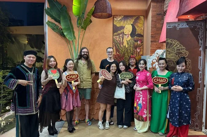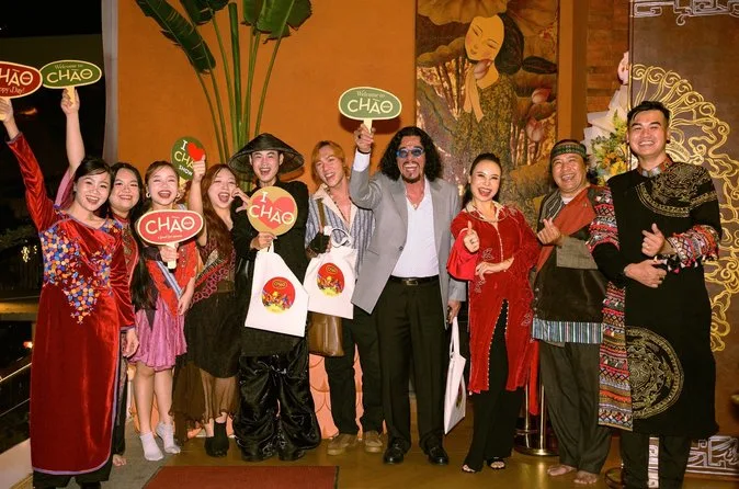 Genieße ein 8-Gänge-Tasting-Menü, während dich bei der Chao Show in Ho-Chi-Minh-Stadt live vietnamesische Volksmusik umgibt. Erlebe seltene traditionelle Instrumente auf der Bühne mit beeindruckenden Bildern und 3D-Sound. Schlürfe Aprikosenwein, koste Aromen aus ganz Vietnam und teile stille Lacher mit Einheimischen, während Geschichten durch die Musik lebendig werden.