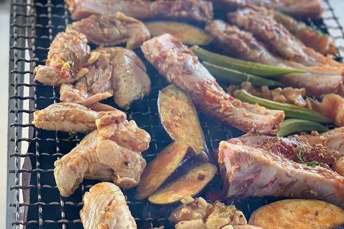 Gegrillte Schweinerippchen, Hähnchen, Rindfleischspieße, Salat, Gemüse vom Hof und Obst.