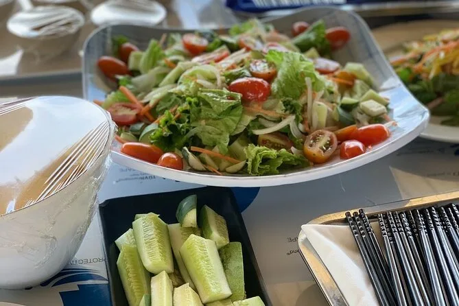 Mittagessen gab’s auf Minhs Familienhof – nichts Schickes, einfach lange Holztische unter einem Blechdach, und überall der Duft von Holzkohle und gegrillten Schweinerippchen. Seine Tante reichte mir einen Teller voll mit Hähnchen, Rindfleischspießen und knackigem Salat aus dem eigenen Garten. Gegessen wurde meist mit den Fingern; jemand reichte selbstgemachte Chili-Soße herum, die mich fast umgehauen hätte (im positiven Sinne). Es wurde viel gelacht und zwischen Vietnamesisch und Englisch gewechselt – ich habe „cảm ơn“ ziemlich verhunzt, aber sie lächelten trotzdem. Es fühlte sich ganz anders an als Essen im Restaurant: irgendwie langsamer, herzlicher.