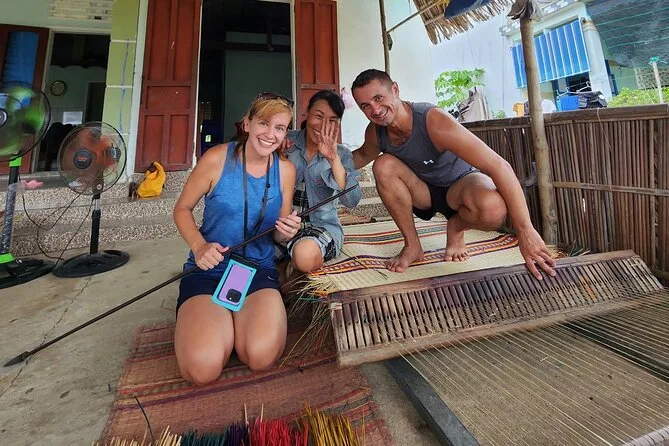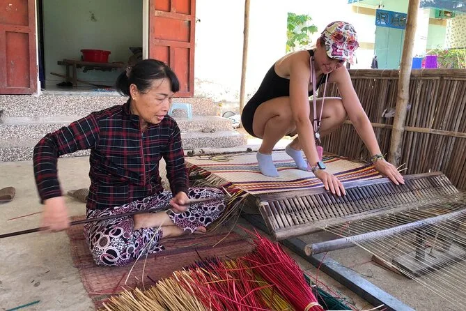 Wir glitten etwa eine Stunde lang den Thu Bon Fluss entlang. Die Zeit schien dort draußen irgendwie langsamer zu vergehen. Der Mangrovenwald war dichter als erwartet – hinter der nächsten Flussbiegung sah man kaum etwas. An einer Stelle zeigte Minh uns alte Fischeraltäre, die zwischen den Palmen versteckt lagen. Er erzählte, wie die Menschen hier seit jeher mit den Gezeiten leben. Dann erreichten wir das Dorf Duy Vinh, das auf den ersten Blick verschlafen wirkte, doch aus offenen Türen hörten wir das Klappern von Webstühlen. Eine Frau namens Lan winkte uns herein und zeigte, wie sie Schilf zu Matten verwebt – ihre Hände bewegten sich so schnell, dass ich kaum folgen konnte. Sie ließ mich probieren (ich vermasselte es sofort, sie lachte nur). Diese rhythmische Arbeit hatte etwas Beruhigendes.