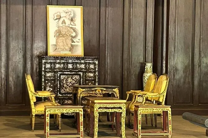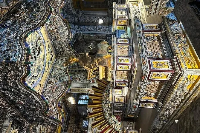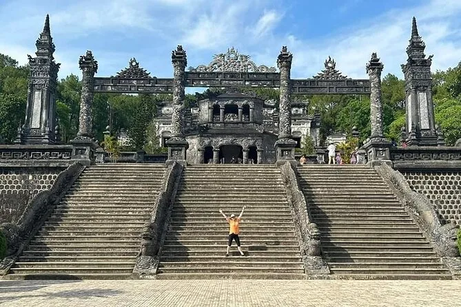 Mittagessen gab’s an einem versteckten Ort nahe dem Dong Ba Markt – nichts Schickes, aber das Bun Bo Hue war scharf genug, um uns ins Schwitzen zu bringen. Danach fuhren wir zum Khai Dinh Grab. Ein wilder Mix aus vietnamesischer Tradition und französischem Stil, hoch oben auf einem steilen Hügel mit moosbedeckten Stufen und überall geschnitzten Drachen.