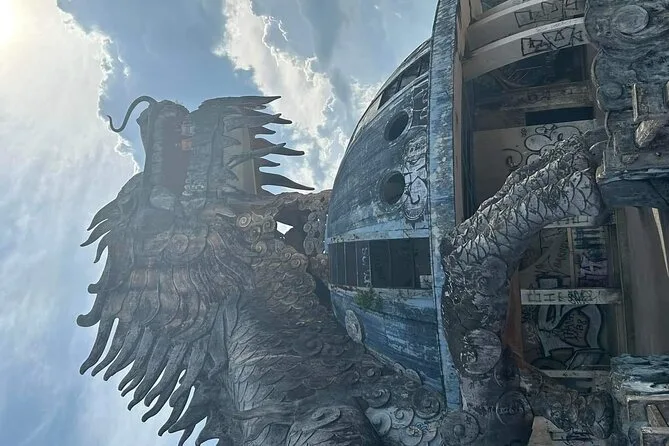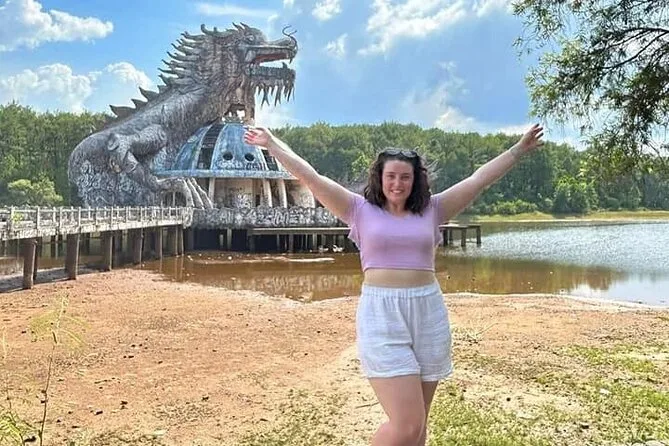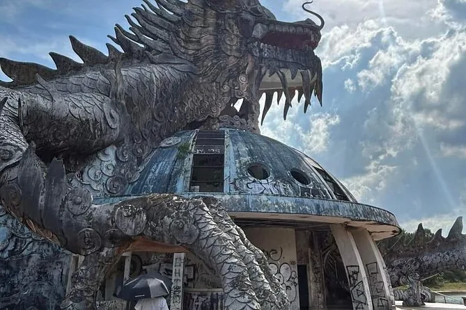 Der letzte Stopp? Der verlassene Wasserpark am Thuy Tien See. Hier ist es seltsam still, nur Vogelgezwitscher und das Knirschen von Kies unter den Füßen. Die riesige Drachenskulptur thront über allem – innen ist es dunkel und hallt, überall Graffiti und zerbrochene Becken, in denen einst Krokodile lebten (Warnschilder hängen noch). Aus dem Maul des Drachen hat man einen eigenartigen, aber friedlichen Blick über den See und die Kiefern – fast wie in einer anderen Welt.
