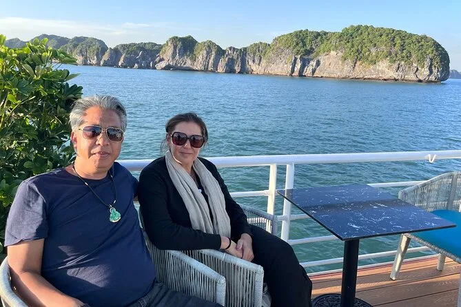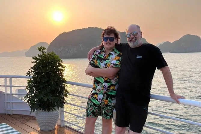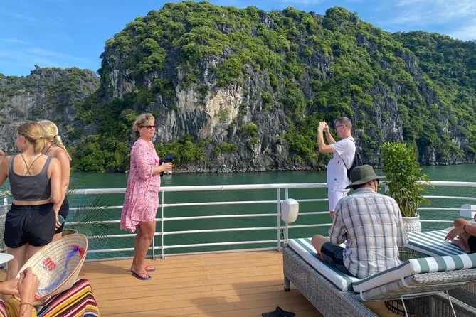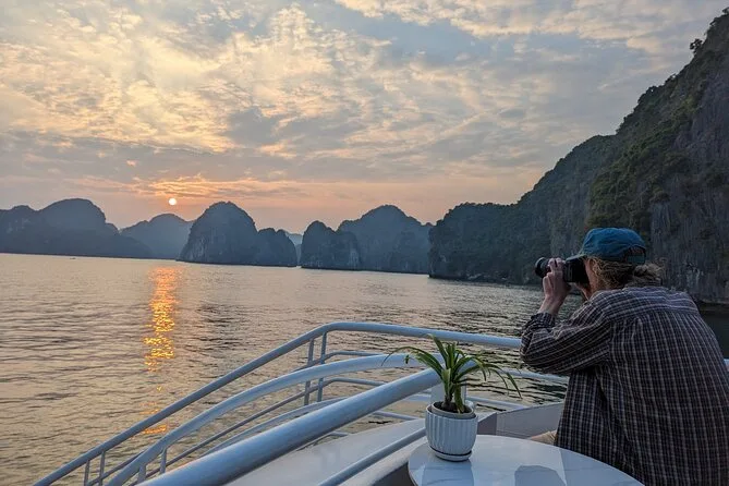 Unser Guide Minh hatte diese ruhige Art, Dinge zu erklären, ohne dass es sich wie Schule anfühlte – er zeigte uns das Fischerdorf Cai Beo, als wir vorbeifuhren, mit den Häusern, die direkt an den Klippen zu schweben schienen. Er erzählte, dass es dort schon seit Tausenden von Jahren Menschen gibt. Ich versuchte mir vorzustellen, wie es wäre, dort zu leben – ehrlich gesagt kaum vorstellbar. Kurz darauf gab’s Mittagessen (der Klebreis war richtig lecker), und jemand am Tisch versuchte zu erraten, was die Hälfte der Gerichte war – Minh lachte und meinte, seine Oma wäre stolz, wenn wir alles aufessen würden.