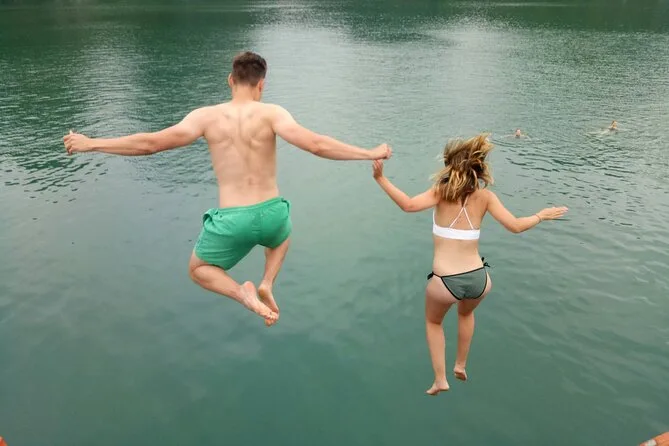 Ja, es gibt Stopps zum Schwimmen in ruhigen Lagunen und an Stränden wie der Drei-Pfirsich-Bucht.