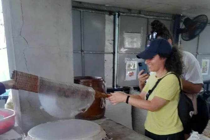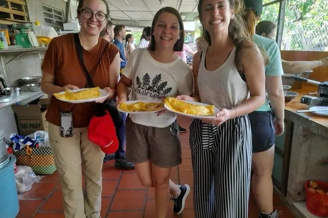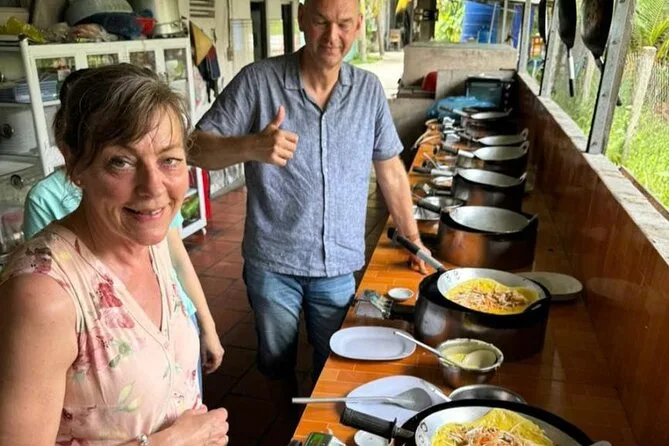Du probierst bánh khọt (kleine herzhafte Pfannkuchen), Honigtee, Kokosnussbonbons, tropische Früchte und ein vietnamesisches Mittagsmenü mit veganen Optionen.