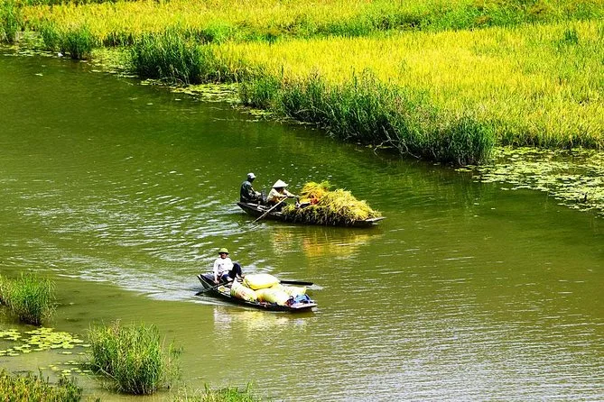 Die Sampanfahrt dauert etwa 1,5 Stunden auf dem Ngo Dong Fluss – dabei sieht man Höhlen, Reisfelder und das lokale Leben am Ufer.