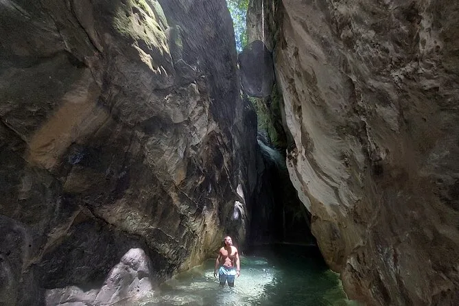 The total hike lasts about 4-5 hours including swimming and climbing sections.