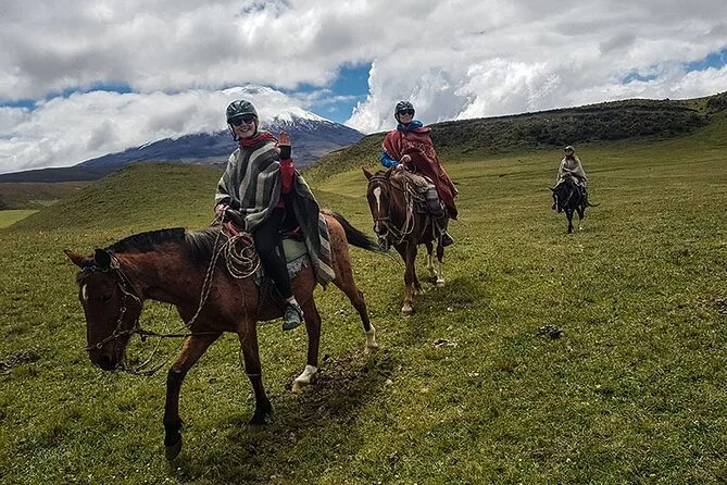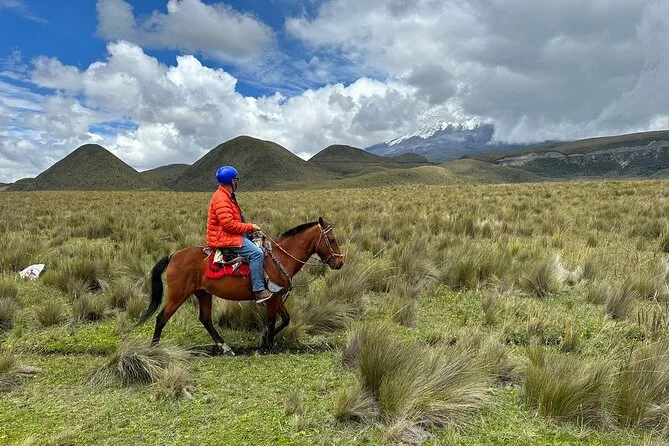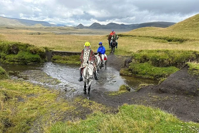 Your day includes private hotel pickup in Quito, all transportation into Cotopaxi Park, safety gear for horseback riding with both an English-speaking guide and a local chagra horseman leading you along the trails, a traditional Ecuadorian lunch after your ride, plus time trekking around Limpiopungo Lagoon before heading back in the afternoon.