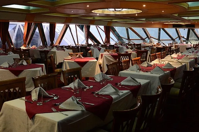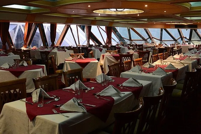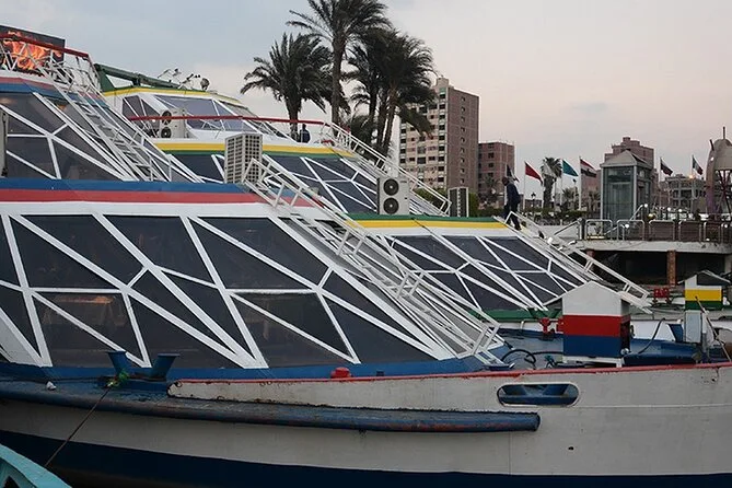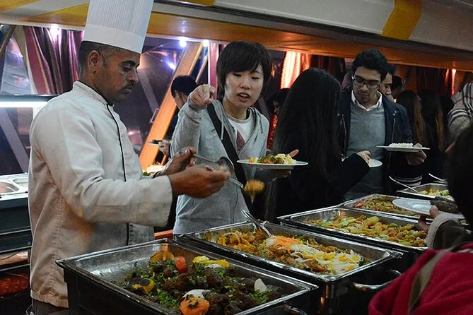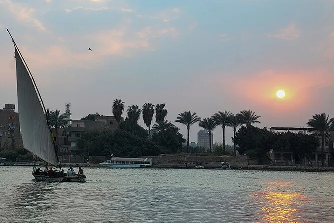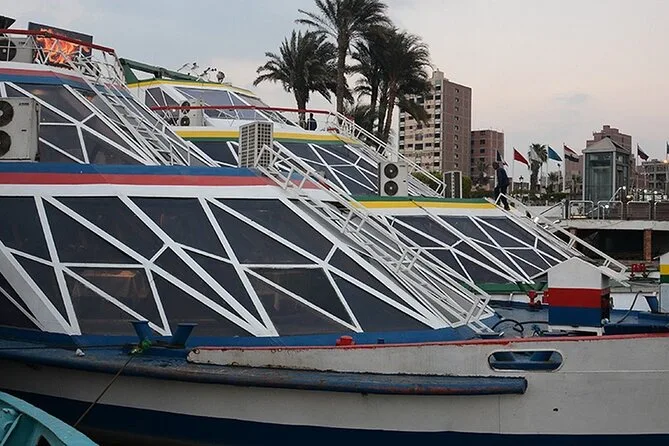 Your evening includes private transportation from your hotel to the dock and back again, plus an open buffet dinner served onboard as you drift along the Nile River. You'll also enjoy live entertainment with folkloric dance performances—all while watching Cairo's skyline light up at sunset before returning comfortably to your hotel.