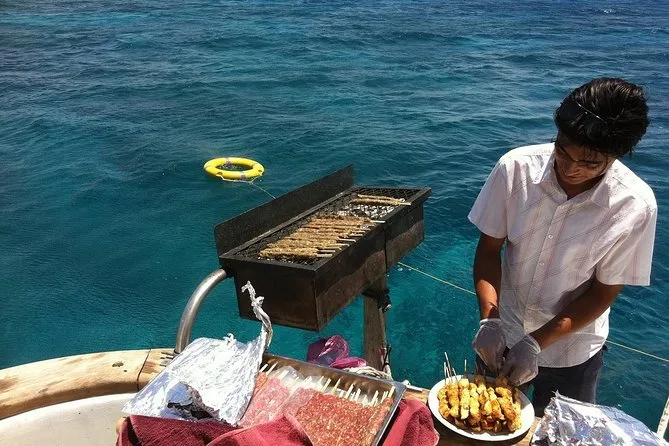 We got two hours on the island itself, which sounds short but felt just right. Some people went straight for volleyball or cocktails at the juice bar; I mostly wandered along the edge of the water, letting my feet sink into that weirdly cool sand. At one point I tried to order a drink in Arabic — Samir laughed and fixed it for me, but hey, at least I tried. Lunch back on board was way better than I expected (the grilled fish especially), and there was plenty of time to just sprawl out on deck before we moved on to snorkeling.