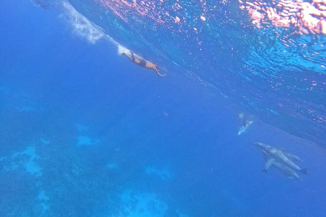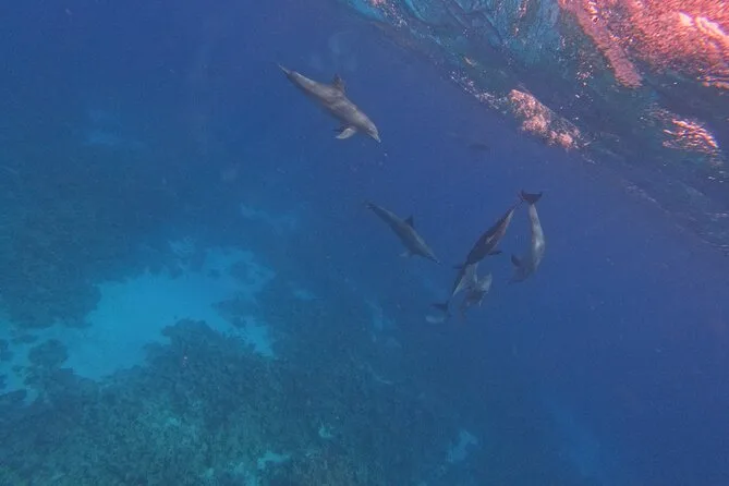 The search for dolphins was longer than I expected — maybe an hour? Time got weird out there. We scanned the water for those quick silver arcs, everyone squinting into the sun. Suddenly Mahmoud pointed and shouted something (I think it was “look!” in Arabic). There they were — a whole pod weaving through the blue. We watched quietly at first, then someone laughed and it broke the spell. If you’re lucky (we were), you can slip into the water and swim near them — not too close though, Mahmoud made sure we kept our distance so we didn’t bother them. I still remember how cold the water felt compared to the air.