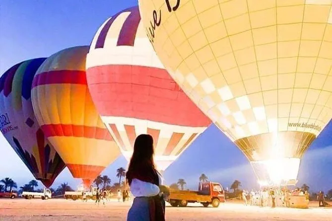 Your day includes early morning hotel pickup by luxury vehicle, sunrise hot air balloon ride over Luxor with flight certificate, bottled water throughout your trip, transfers by motorboat to cross to the West Bank, all main entry fees covered for sites like Karnak Temple and Valley of the Kings (with optional extra tickets for special tombs), plus a traditional local lunch before returning to your hotel or Nile cruise boat in Luxor.
