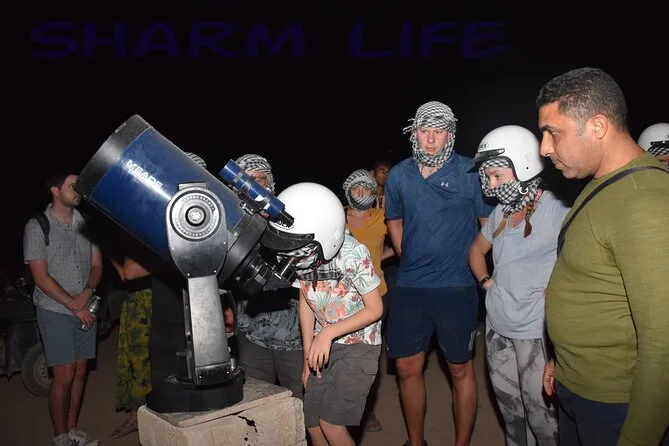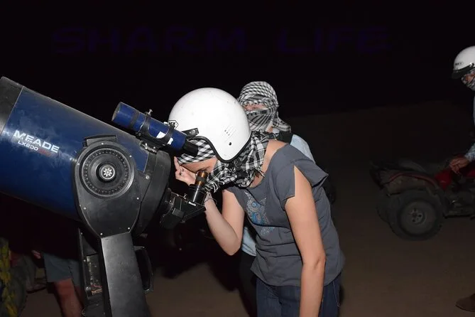 Your evening includes hotel pickup and drop-off in an air-conditioned vehicle from anywhere in Sharm El Sheikh or nearby accommodations, all use of new quad bikes (with helmet), camel rides (more than once if you want), unlimited Bedouin tea throughout, bottled water and soft drinks at dinner, access to high-powered telescopes for guided stargazing with astronomy experts, live oriental show during dinner with both vegetarian and non-vegetarian buffet options—and yes, there are toilets along the way before heading back to your hotel at night.