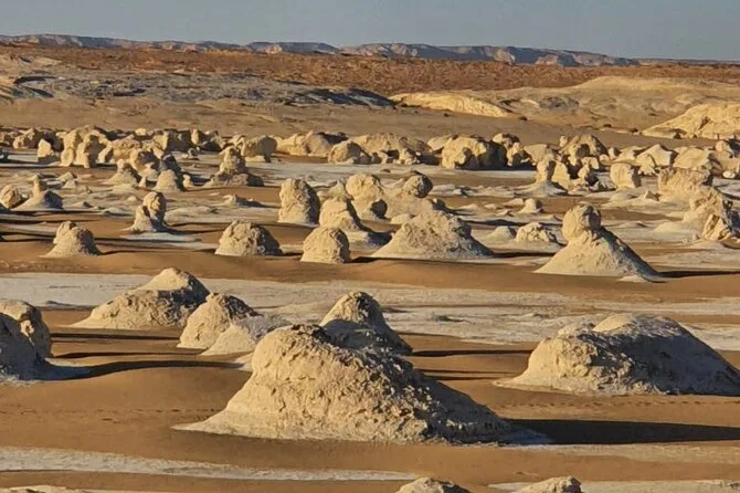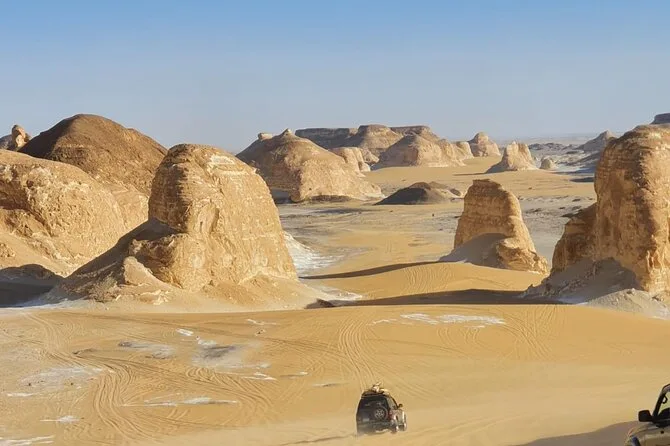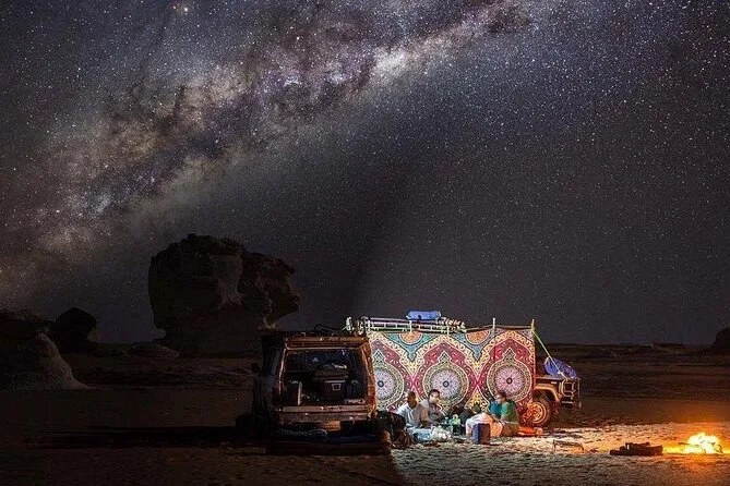 Your three days include pickup and drop-off at your Cairo hotel by private vehicle; all entrance fees; overnight camping with full equipment; one night’s stay at Alaya Hotel; guided jeep tours through both Black and White Deserts; all meals including campfire dinners; mineral water and tea throughout; plus a relaxing visit to Bir Sigam hot spring before heading home.