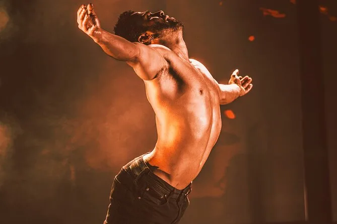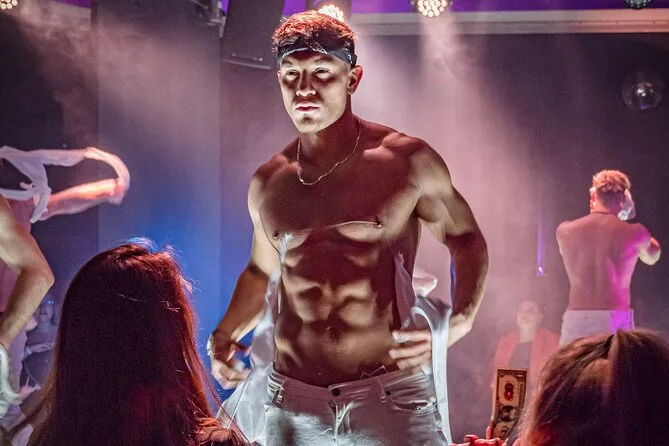 El show combina danza masculina, canto en vivo, acrobacias y entretenimiento interactivo.
