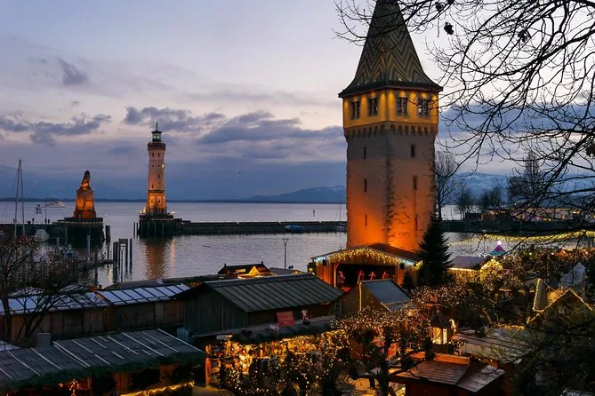 Tu día incluye un guía profesional privado solo para tu grupo (con opción de personalizar la ruta), acceso completo para explorar cada rincón del Mercado Navideño del puerto de Lindau junto al lago de Constanza, con paradas en casetas decoradas para probar delicias a tu ritmo, además de paseos por torres históricas y iglesias en la isla — todo totalmente accesible para cochecitos o sillas de ruedas si es necesario.
