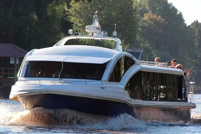 El barco serpenteaba por estrechos arroyos—Río San Antonio, Tres Bocas, Río Capitán Sarmiento—cada uno más silencioso que el anterior. A veces solo se escuchaba el chapoteo del agua contra el casco y el lejano zumbido de una cortadora de césped en alguna isla. Las casas sobre pilotes parecían habitadas, con ropa tendida y perros ladrando a los barcos que pasaban. Nuestro guía explicó cómo las familias dependen de pequeños barcos de provisiones que pasan cada mañana. Es un ritmo de vida totalmente distinto al del centro porteño.