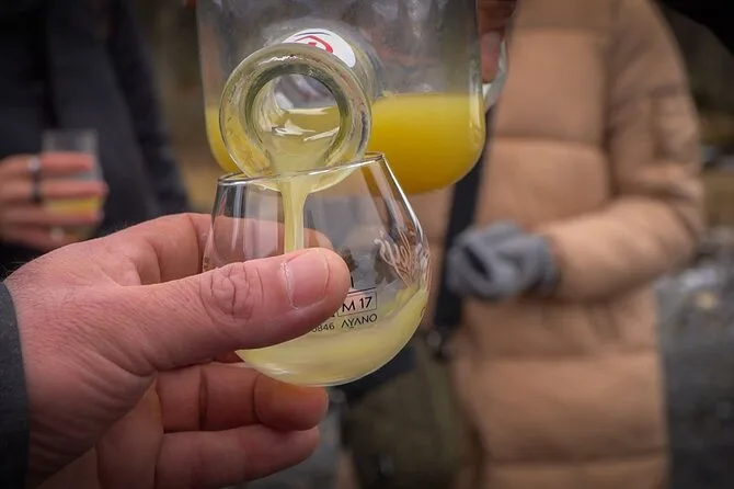 Se ofrecen agua embotellada, refrescos, vino Malbec, café/té y licor casero junto con el almuerzo.