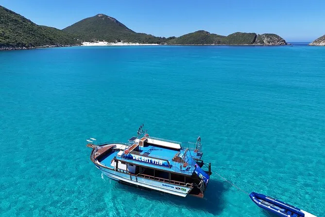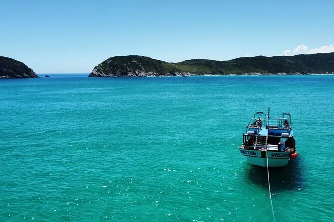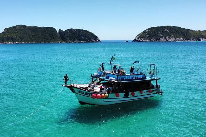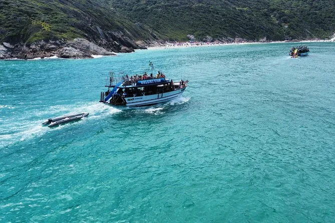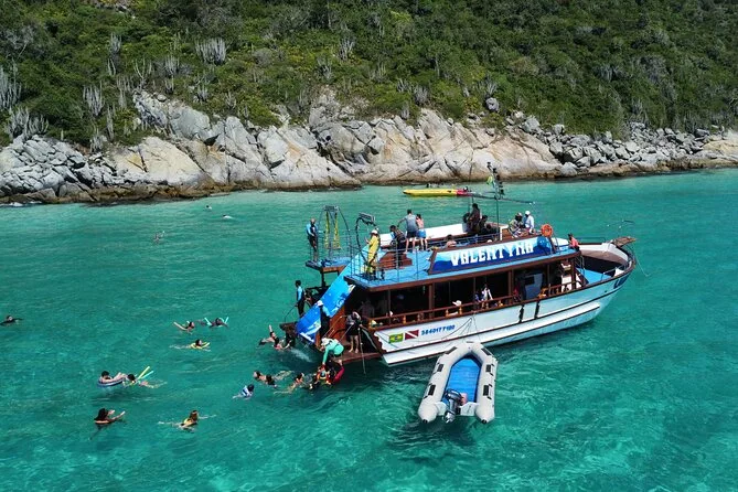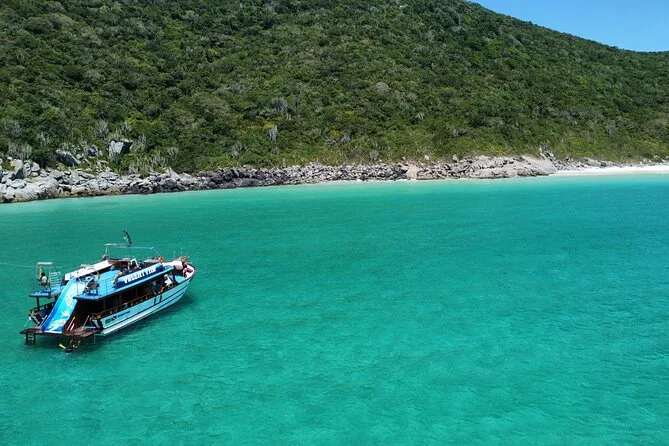 Sentirás el viento atlántico mientras recorres las calas azules de Arraial do Cabo en un barco de dos pisos con tobogán, snacks de fruta, Wi-Fi y guías que conocen cada historia de estas playas. Nada en Ilha do Farol si la Marina lo permite ese día — a veces la magia está en lo impredecible.