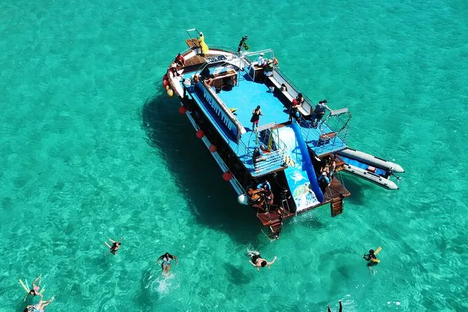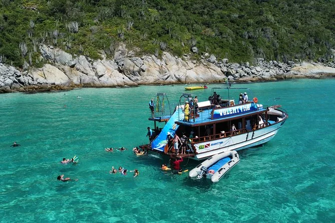 Tu día incluye embarque en Porto do Forno con un equipo local que te guía entre calas y playas alrededor de Arraial do Cabo. Hay Wi-Fi gratis para compartir tus momentos al instante, dos baños para tu comodidad, agua fresca y fruta durante las pausas, macarrones flotantes para relajarte en el agua, uso del tobogán si te animas, y personal que ayuda a todos a bajar seguro a las playas en pequeñas lanchas.