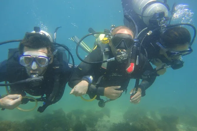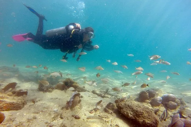 Tu día incluye el uso completo del equipo de buceo — botella, cinturón de lastre, traje de neopreno, regulador, chaleco, máscara y aletas — además de un guía DiveMaster exclusivo que te acompaña desde la entrada hasta la salida en las playas protegidas de Búzios.